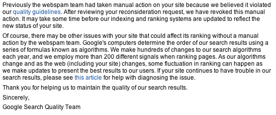 Вече би трябвало да сте добили представа как да покажете на Google, че правите всичко възможно лошите линкове да бъдат премахнати. За съжаление, ако не положите усилия и не следвате гореспоменатите съвети, няма как наложеното наказание да бъде премахнато. Отделете време, направете задълбочен анализ и работете системно по списъка с линкове.